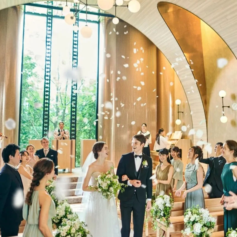 【緑×自然光×建築美!一度は見たい感動チャペル】柔らかな木の曲線がドレス姿を美しく引き立てるチャペルは、一目惚れする花嫁も多い。映像が流せるプロジェクター付だから、入場前に想いを伝える感動の挙式を